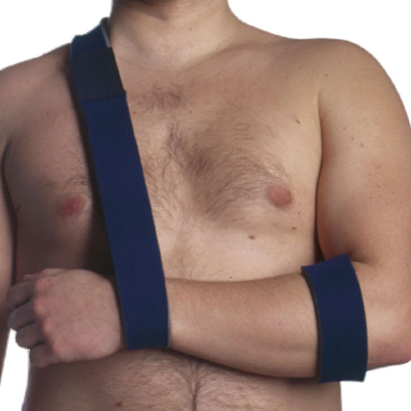 - De armsling/-draagband wordt ingezet ter ondersteuning van de arm en houd deze tegen het lichaam aan